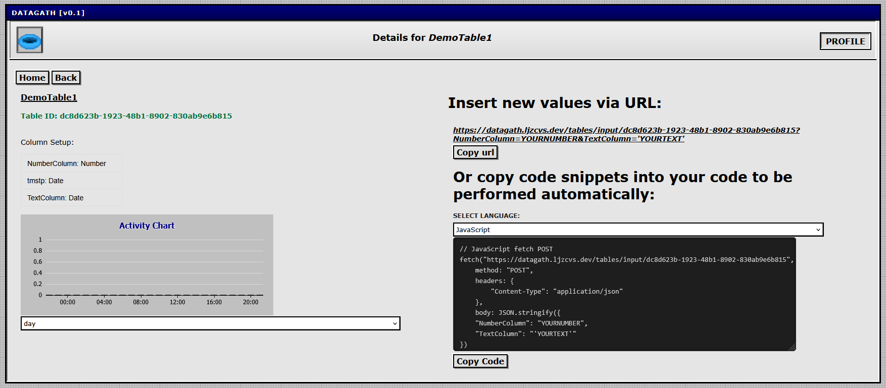>>> From there the user can easily acces more data on the table, or generate code snippets/GET requests for inserting new values into the table.